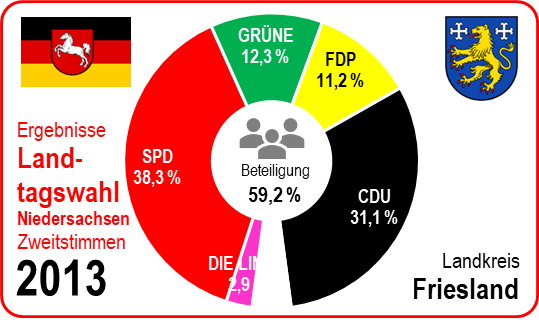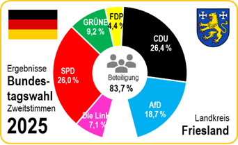 In der umfangreichen pdf-Broschüre "wahl lokal" sind die Endergebnisse aller Städte und Gemeinden im Landkreis Friesland aufgeführt (... und natürlich auch als Summe für den Landkreis).