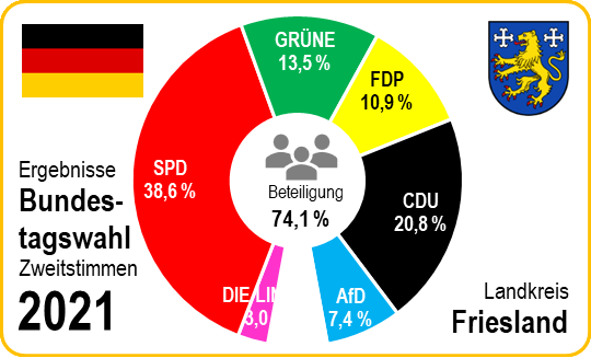 In der umfangreichen pdf-Broschüre "wahl lokal" sind die Ergebnisse für Erststimmen und für Zweitstimmen sowohl als Gesamtergebnis als auch umrechnet für alle Orte des Landkreises Friesland genannt. Für eigene Beurteilungen der Daten sind diverse Statistiken bis 2023 vorhanden.
