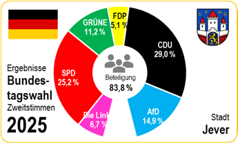 In der umfangreichen pdf-Broschüre "wahl lokal" sind die Ergebnisse für Erststimmen und für Zweitstimmen sowohl als Gesamtergebnis als auch umrechnet für alle Stadtteile von Jever genannt. Für eigene Beurteilungen der Wahlergebnisse sind diverse amtliche Statistiken zur Bevölkerungsstruktur vorhanden.