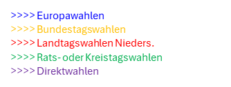 Zur schnellen Unterscheidung der Wahlen wird grundsätzlich das gleiche Farbschema in allen Dateien verwendet.