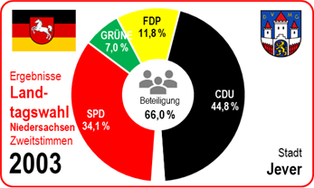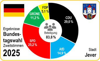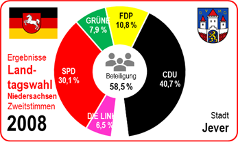 In der umfangreichen pdf-Broschüre "wahl lokal" sind die Ergebnisse für Erststimmen und für Zweitstimmen sowohl als Gesamtergebnis als auch umrechnet für alle Stadtteile von Jever genannt. Für eigene Beurteilungen der Wahlergebnisse sind diverse amtliche Statistiken zur Bevölkerungsstruktur vorhanden.